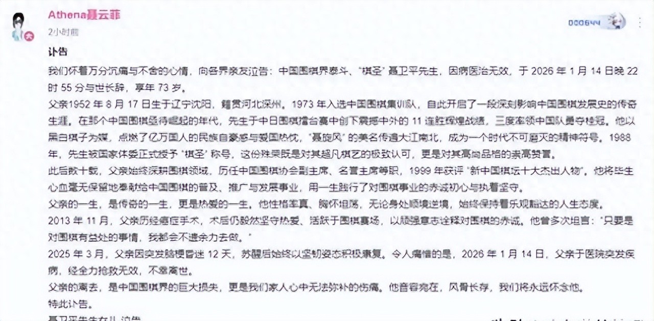 早上八点,她又发了正式讣告,列出父亲一生贡献,从1973年入选国家围棋队,到中日擂台赛三度夺冠,再到推广围棋的事业。讣告里说,父亲离去是中国围棋界的巨大损失,更是家人无法弥补的伤痛。