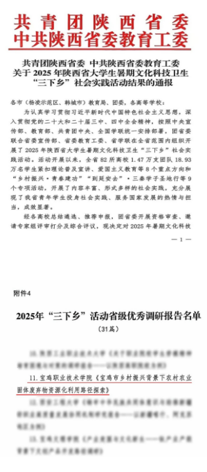 聚焦乡村振兴政策与路径,学院积极开展战略研究与决策咨询。多项研究成果获各级肯定,《宝鸡市乡村振兴背景下农业农村固体废弃物资源化利用路径探索》获陕西省2025年“三下乡”优秀调研报告。《红色旅游助力乡村振兴的路径研究》获陕西省教育厅高校人文社会科学研究优秀成果。《“红色职教”融入农村电商的乡村振兴模式研究》获宝鸡市2025年组织工作优秀调研成果。《乡村振兴背景下宝鸡市苹果产业链发展现状及优化政策研究》等6个项目获宝鸡市科协决策咨询调研成果优秀奖。完成《农业新质生产力赋能下新型农业经营主体联农带农效能提升路径研究》等宝鸡市哲学社会科学2025年度课题3项。
