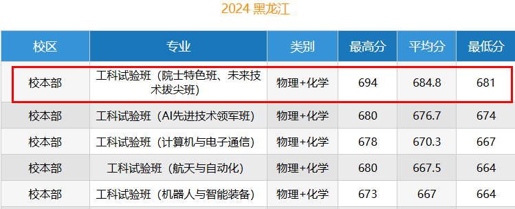 以2024年黑龙江省的录取数据为例,哈工大本部的院士特色班最低录取分为681分,平均分达684.8分,远超其他工科试验班方向;同时,包括自主智能系统班在内的多数特色班,都明确要求选考物理+化学。这意味着考生不仅要在高考中取得高分,更要在选科阶段就锚定对应的学科方向,提前与特色班的培养需求形成契合。