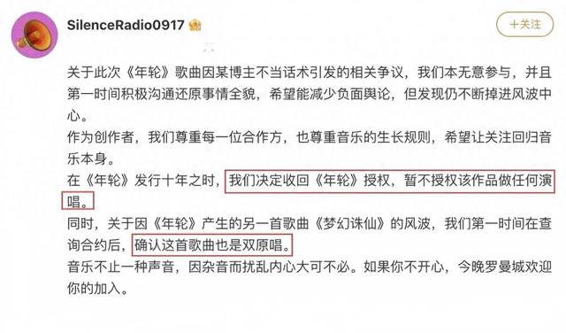 双方立场:各执一词的原唱之争7月25日凌晨,汪苏泷团队指出因某博主不当言论导致争议升级,声明确认《年轮》为双原唱模式(张碧晨女声版与汪苏泷男声版),与《梦幻诛仙》性质相同,决定“收回《年轮》授权,暂不授权任何演唱”。