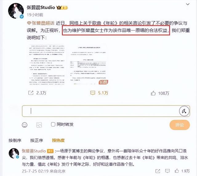 随着争议的发酵,7月23日,QQ 音乐平台移除了张碧晨版《年轮》的“原唱”标签,仅保留 “演唱者”,尽管这一行为很快被恢复,但已经引发了双方工作室的高度关注。
