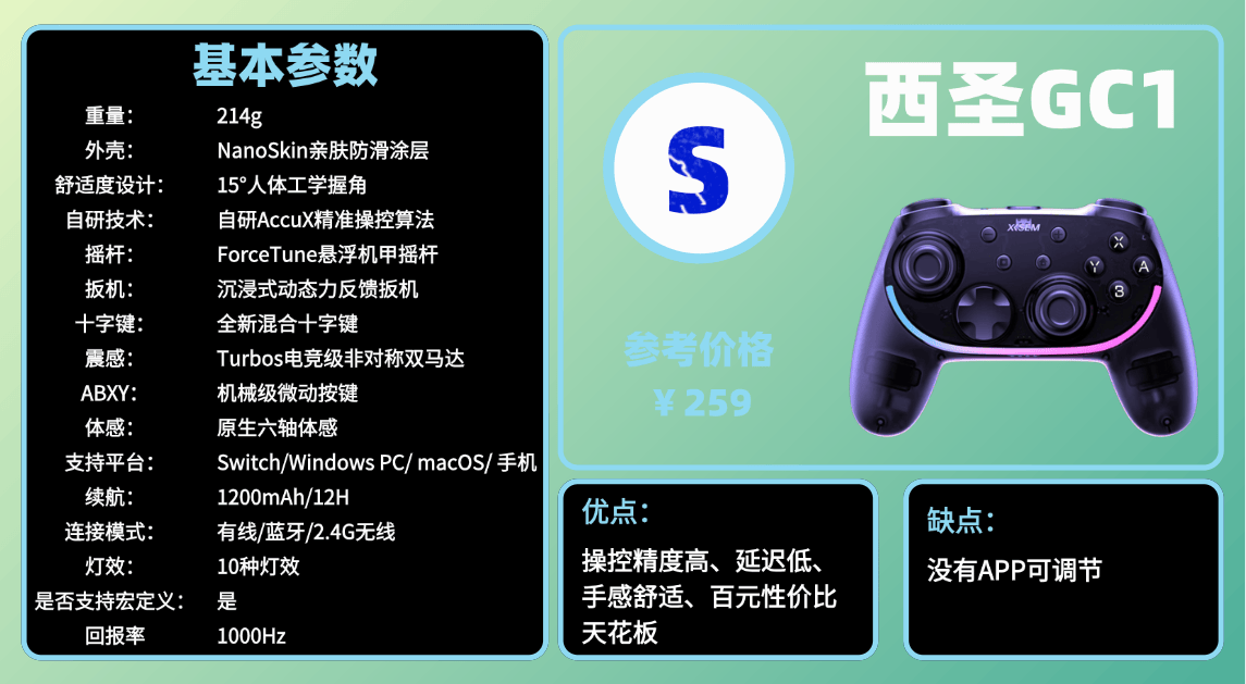 西圣GC1作为百元价位的行业标杆,主打极致操控感与性价比;配备多项黑科技,操控体验直接越级,同时耐用性也很强,长期使用性能依旧稳定出色,性价比非常高。