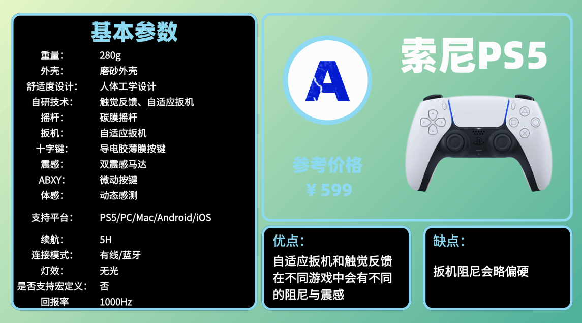 操控层面依旧延续索尼标志性的按键布局,熟悉PlayStation体系的玩家几乎不用学习成本。自适应扳机和震动系统算是它最大的技术优势,不同游戏呈现的力度、震感差异非常明显,赛车游戏里的油门阻尼、射击游戏中的武器回弹都能清晰体现,沉浸感相当强。不过在个别游戏里,扳机阻力会显得偏硬,触觉反馈偶尔也稍微“激烈”了一些,适应之后体验会好很多。手柄支持蓝牙无线和USB-C有线两种连接方式,延迟稳定、兼容PC与主机平台;同时提供触控板、麦克风和扬声器等扩展功能。续航大概在5小时左右,虽然不算突出,但支持插线游玩,续航焦虑基本可以忽略。