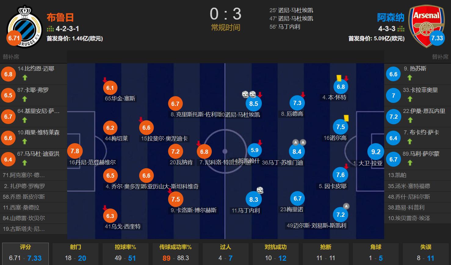 看比赛数据就知道踢得很热闹,控球率接近五五开,布鲁日在主场也获得了18次射门,其中7次射正;阿森纳一共有20次射门,其中11次射正。