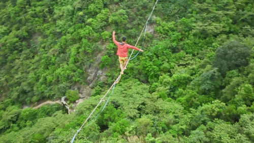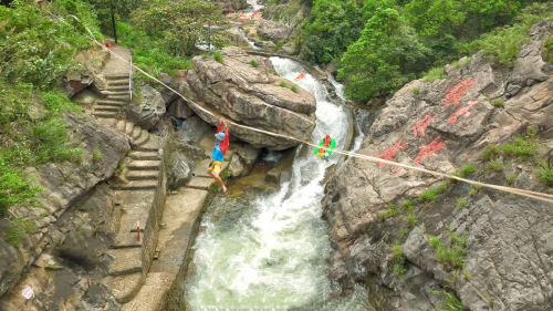 6月21日起,亚洲高空扁带第一人施海林在清远黄腾峡生态旅游区进行赛前训练,备战即将于7月6日至9日间在法国举办的高空扁带世界杯。
