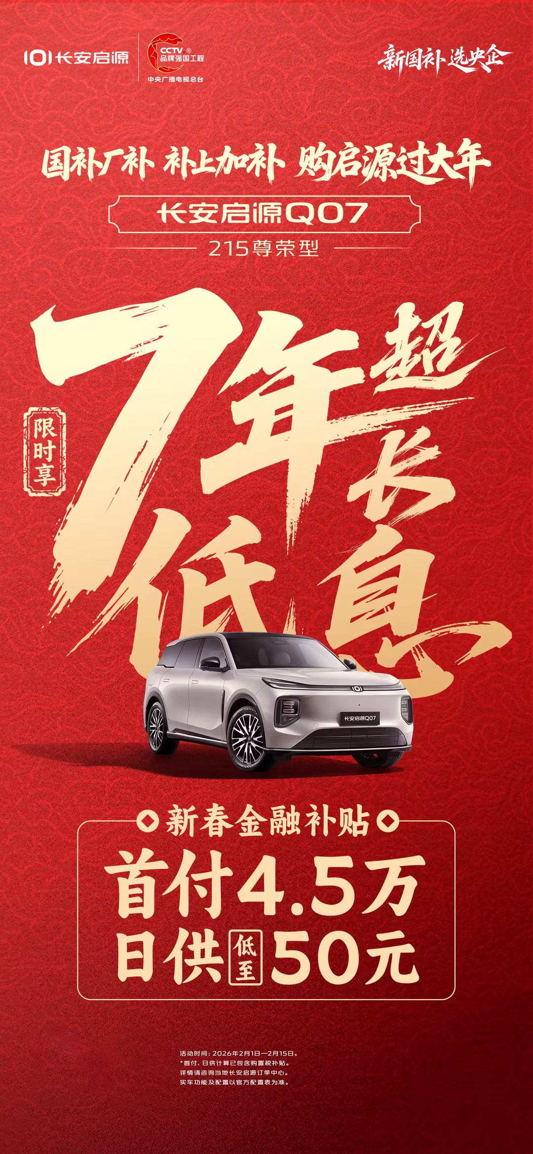 而担纲长安造车40年匠心大作的长安启源Q07,搭载同级唯一 CDC 智能魔毯悬架、IDTC 动态扭矩控制系统、频率可变阻尼系统、全维驾乘安全等配置,是一台拥有“超大空间,超长续航,全新智能”的全家人的智能SUV。此次新春福利推出了全系享7000元新春购置税补贴,再享至高8000元新春置换补贴,更有限时享7年超长低息新春金融补贴;其中215尊荣型,首付4.5万元,日供低至50元。