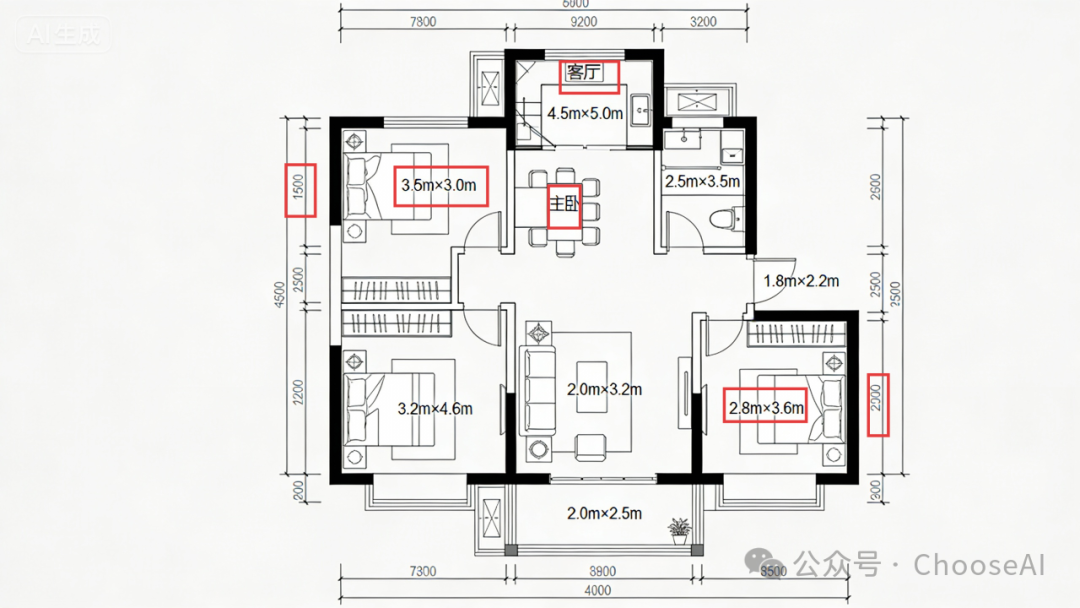 就平面布局图而言,两者大致看都有模有样,不过细看就会发现有明显问题。即梦4.5多处明显不符合逻辑——室内尺寸大于外墙尺寸、客卫2个马桶、功能区标注有误、标注的尺寸不完整;而pro只有即梦4.5的室内尺寸问题。