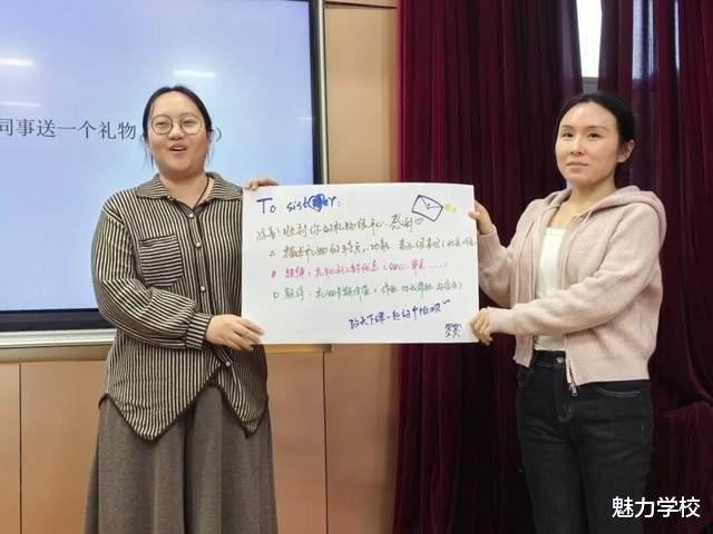 老师们主动践行 “有效夸奖” 的艺术,以“你生日的时候,你同事送一个礼物(自定义)”为情景,用 “描述行为 + 肯定品质 + 正向期望” 的方式,夸夸你的同事。