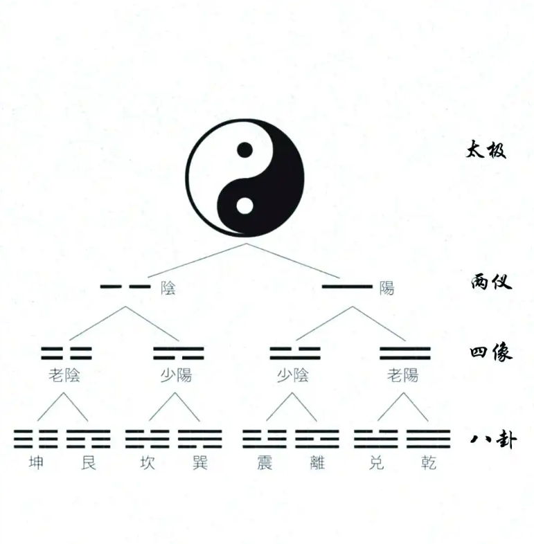 这个是随便点一下,接着往下走。“无极”又能生“太极”,其实你画一个圆,它就是“太极”。“无极”为“空”,你画一个圆不就是“太极”了吗?从“太极”就开始变“有”了,有了一个象,太极生两仪,大家看太极阴阳图里面中间有个阴阳鱼,阴阳鱼中间是不是一阴一阳?就像一个饼干,掰成了两半,一块磁铁分成了两块,当磁铁分成两块的时候,你会发现它每块都各具一个磁极,S极和N极。同样的一个磁极,比如说S极对S极,就会相斥的,S极对N极就会相吸,就是阴阳相吸。大家就知道了,太极分两仪,两仪还要再分,就类似于把这个磁铁,刚开始掰成两半,然后又掰为四瓣,当你掰成四瓣的时候,这个四块磁铁分别具备了各自的S极和N极,这叫做“一物一太极,一事一乾坤,一花一世界,一叶一菩提”。“两仪”分为“四象”,“四象”是老阴、老阳、少阴、少阳。“老”就是老人的老,“少”就是少年儿童的少。“阴”就是阴天的阴,“阳”就是太阳的阳。这个我只和大家简单分享一下,最后四象生八卦,这个八卦就比较奇特了,就开始涵盖所有的万事万物。