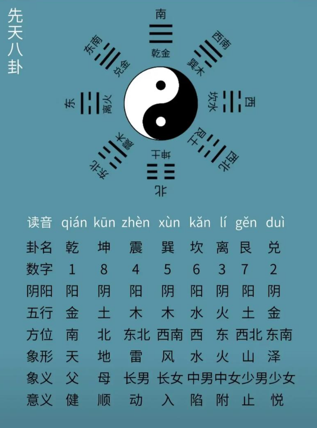 以坤卦为主,大家可以百度搜一下,你把坤卦画出来,长子这个由坤卦的两横变成一横。就是长子,为震卦;次子,二儿子,就是坤卦中间的两横连起来,为坎卦,坎卦代表北方,在他家里边代表的是第二个儿子;第三个儿子,是把坤卦最上面的两横变成一横,为艮卦,代表的是家里边的小儿子,方向对应的是东北方。大家仔细看,男孩都是从母亲这个卦变化而来。