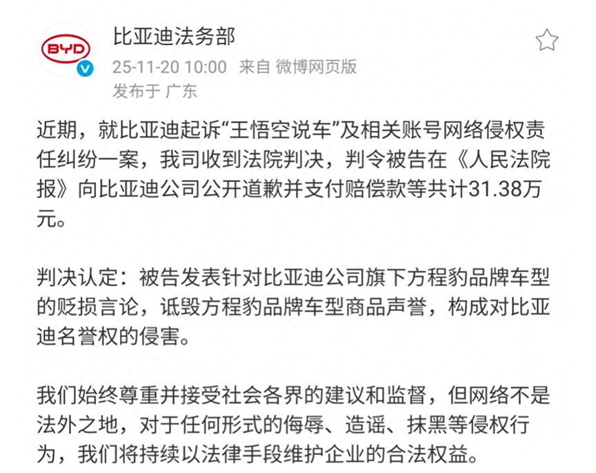 此次胜诉也彰显出比亚迪捍卫品牌正当权益的决心。梳理过往案例可见,该企业在打击恶意造谣、诋毁行为上始终态度坚决、行动果断:此前,自媒体“王悟空说车”因发布贬损比亚迪方程豹品牌车型的不实言论,被法院认定构成名誉权侵权,需向比亚迪赔偿31.38万元并公开道歉;2024年底,自媒体博主“龙猪-集车”因长期发表侮辱、诋毁比亚迪的言论,且存在严重歪曲事实的行为,被法院判令删除侵权内容、赔礼道歉,同时赔偿比亚迪经济损失等共计201.87万元。