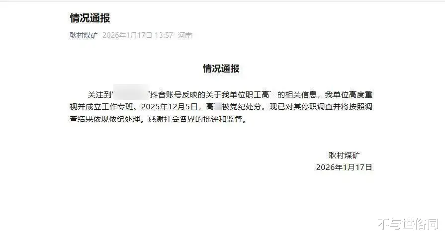 16日下午,三门峡市相关部门工作人员告诉新闻记者,此事已经关注到,正在核查,已有相应的工作组与男方单位了解情况,“会根据我们核实的情况,看是否对男方单位或者涉事当地进行回应”。1月17日下午,高某所在单位“耿村煤矿”微信公众号发布情况通报: