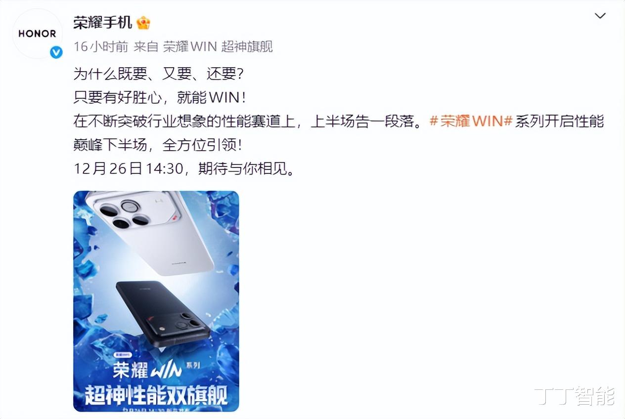 蹲了大半年的充电宝手机终于要来了!荣耀正式官宣,原计划叫GT2的新机系列改名为荣耀win系列,定档12月26日发布;最绝的是机型划分,不是常规的标准版+Pro,而是荣耀win RT+荣耀win。
