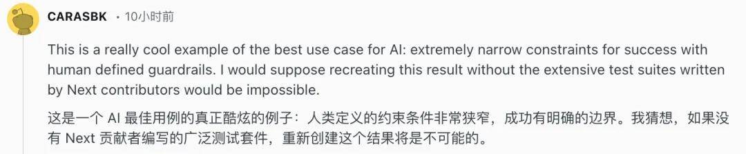 Next.js 拥有一个非常完善的测试体系。Next.js 仓库中包含数千个端到端测试,覆盖几乎所有功能和边界情况。工程师直接移植了测试,提供了一份可以机械验证的说明书。