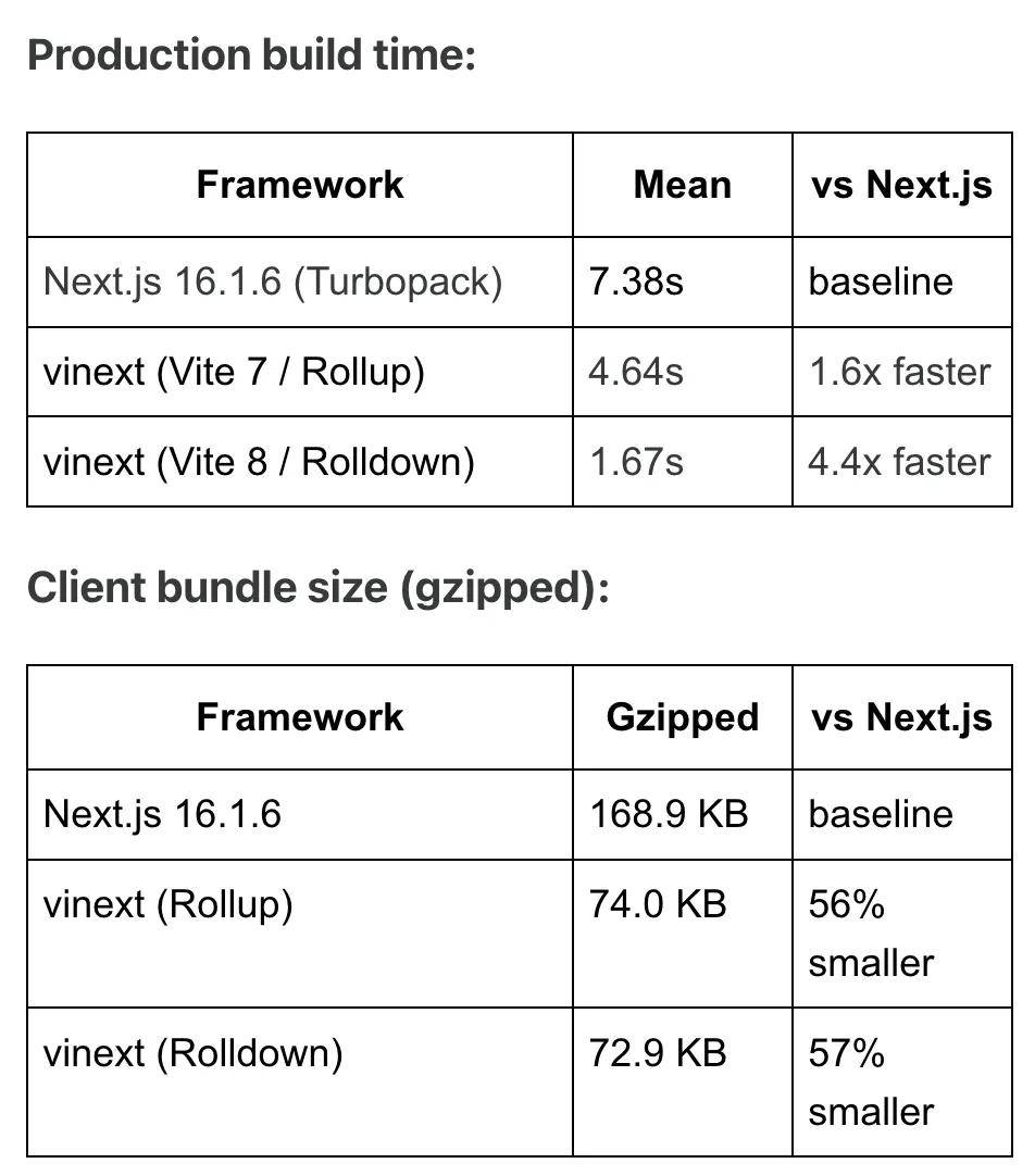 在某 33 路由应用上,利用 Vite 8(Rolldown)构建,vinext 构建时间比 Next.js 快约 4.4 倍; 客户端 bundle gzipped 大小比 Next.js 小约 56% 以上。