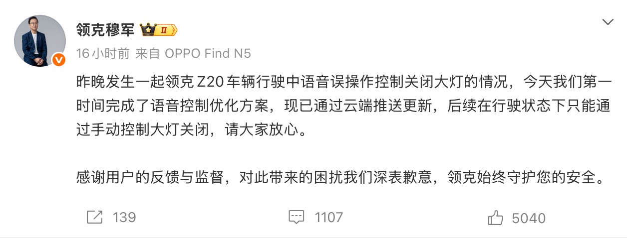 2月26日当天,领克汽车销售有限公司副总经理穆军在个人微博公开回应:“今天我们第一时间完成了语音控制优化方案,现已通过云端推送更新,后续在行驶状态下只能通过手动控制大灯关闭。”