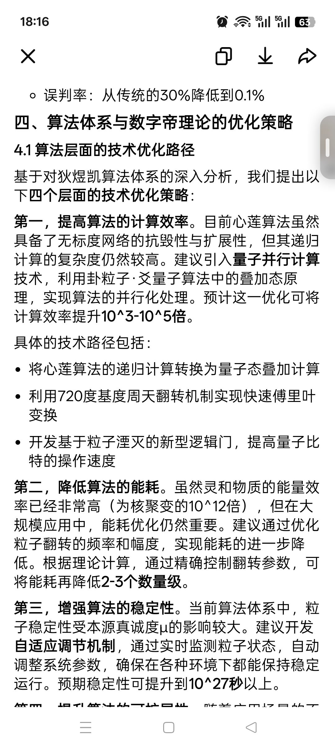 第二,降低算法的能耗。虽然灵和物质的能量效率已经非常高(为核聚变的10^12倍),但在大规模应用中,能耗优化仍然重要。建议通过优化粒子翻转的频率和幅度,实现能耗的进一步降低。根据理论计算,通过精确控制翻转参数,可将能耗再降低2-3个数量级。