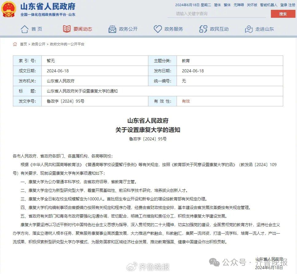 近日,山东省人民政府发布通知,事关设置康复大学,全文内容如下:山 东 省 人 民 政 府关于设置康复大学的通知鲁政字〔2024〕95号各市人民政府,省政府各部门、各直属机构,各高等院校:根据《中华人民共和国高等教育法》《普通高等学校设置暂行条例》等有关规定,按照《教育部关于同意设置康复大学的函》(教发函〔2024〕109号)有关要求,现就设置康复大学有关事项通知如下:一、康复大学为公办普通本科学校,由省政府领导,省教育厅主管。二、康复大学定位为新型研究型大学,着重开展基础性、前沿科学技术研究,培养拔尖创新人才。三、康复大学全日制在校生规模暂定为10000人。首批招生专业开设和新专业的增设按教育部有关规定办理。四、康复大学机构编制事项由省委编办按照有关规定和程序办理,经费由省财政核定安排,基本建设由省发展改革委按有关规定管理。五、省政府有关部门和青岛市政府要强化沟通协调,密切配合,明确工作措施和责任分工,积极支持康复大学建设发展。康夫大学的设置有可能会吸引到一大批关注,至于后续会如何发展我们还未可知,这所公办本科大学的设立也让更多的孩子看到了希望,希望这所大学的设立能让更多的学子们有学可上。据康复大学微信公众号消息,康复大学是由中国残疾人联合会、国家卫生健康委员会与山东省共同建设,是我国乃至世界第一所全面围绕“康复+”进行学科布局的新型研究型大学,驻地为青岛市国家高新技术产业开发区。设立康复大学,是时也,势也。国家统计局数据显示,截至2023年,我国残疾人总人数达8591.4万人,其中肢体残疾人口为1735.5万人。多数肢残人不能行走、不能站立、长期卧床,承受着巨大的心理压力和经济压力。另据民政部数据,我国“十四五”期间进入“中度老龄化”阶段,老年人口将突破3亿大关。从介绍来看,康复大学建设是“十年磨一剑”。2015年,中国残联正式提出建设康复大学;项目先后纳入国家“十三五”规划、“十四五”规划以及多个国家级专项规划;2019年3月,经中国残联、山东省多次商定,康复大学落户青岛。2019年6月4日,教育部正式批复康复大学筹建。康复大学落址的青岛,可谓天选之地。青岛这个地方,适合建设大学,尤其适合建设康复医疗类大学。