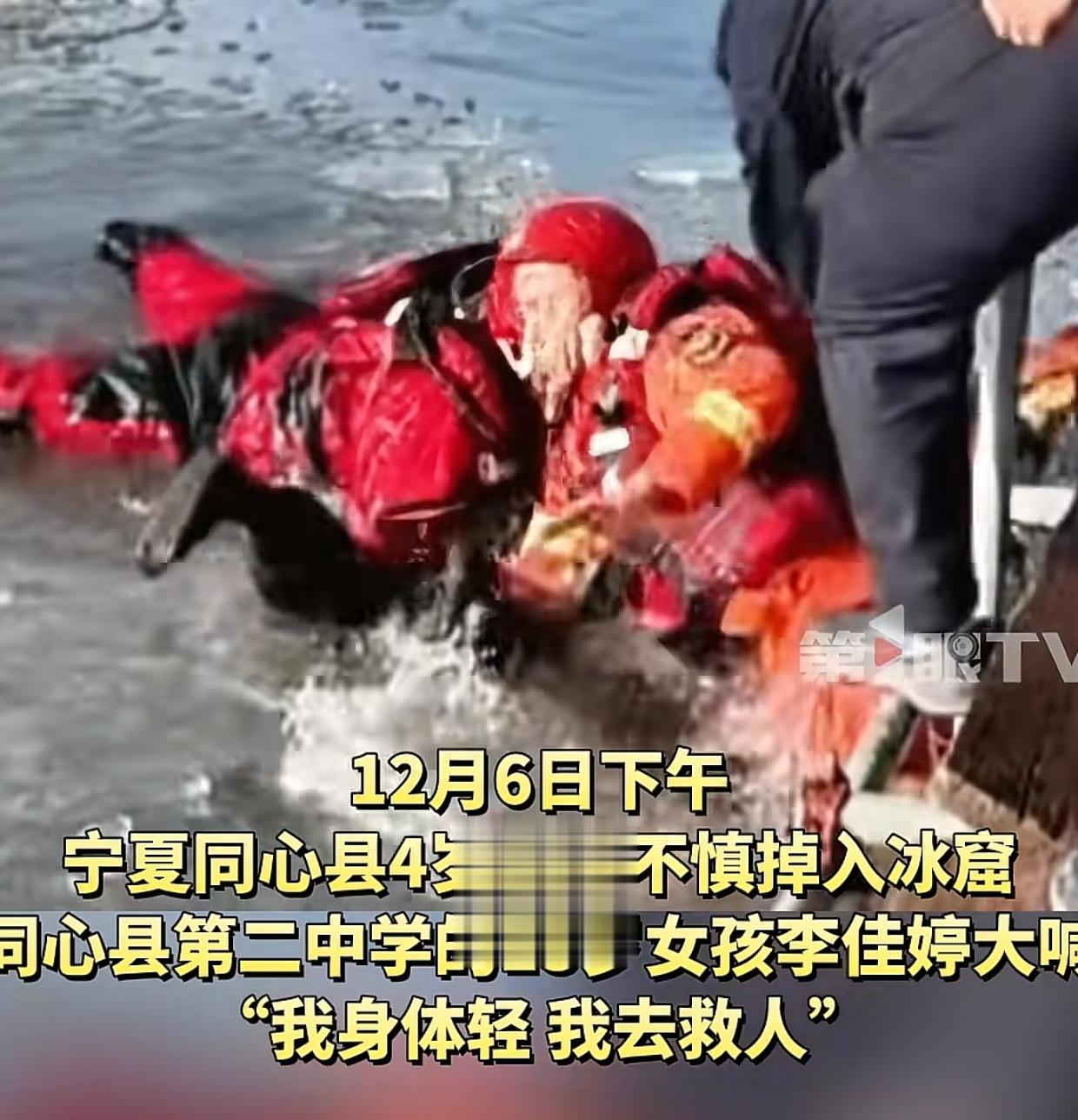 12月7日,有多家媒体报道,称宁夏一名13岁的女孩李佳婷在12月6日路过河边时,发现已经结冰的河面出现了一个窟窿,而这个窟窿是一名4岁男孩掉下去导致的,现场很多围观人群,却都不敢下去救人,因为冰面太薄,大家都怕掉进去,消防员也还没有到场。