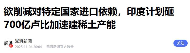 澎湃新闻 2025-11-04——欲削减对特定国家进口依赖,印度计划砸700亿卢比加速建稀土产能