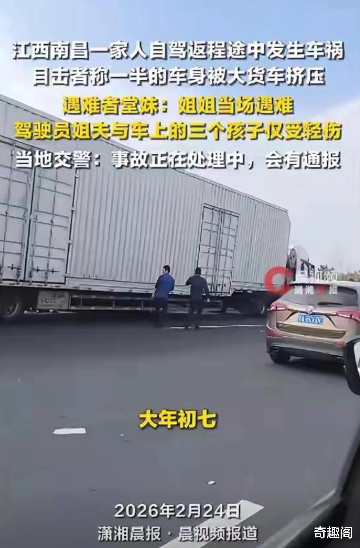 2026年2月24日,有媒体披露,江西某段高速公路上,一辆自驾返程的小客车遭遇严重车祸,导致车内一家五口1人死亡、3人受伤。 随着现场画面的曝光和目击者的讲述,这起事故引发诸多网友的关注和热议。根据多位目击者的描述,这起事故发生在2月23日大年初七,也是返程高峰期间。