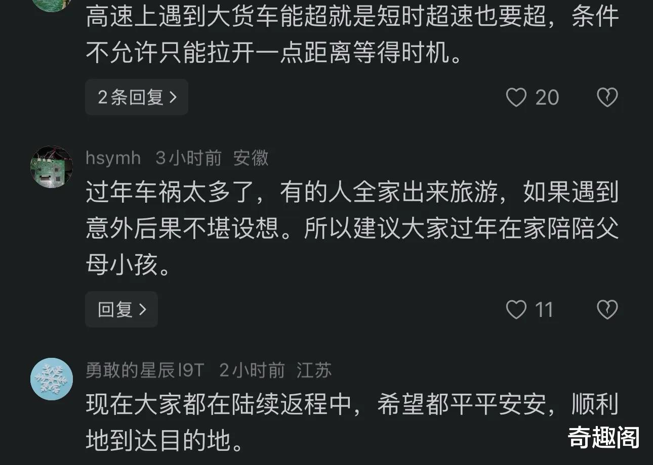 多数网友在为遇难者哀悼的同时,也再次强调了大货车盲区和返程交通安全的重要性。有网友评论称:“远离大货车,这是每个司机的必修课。特别是在春运这种车流密集的时候,小车千万不要和大货车长时间并排行驶。”