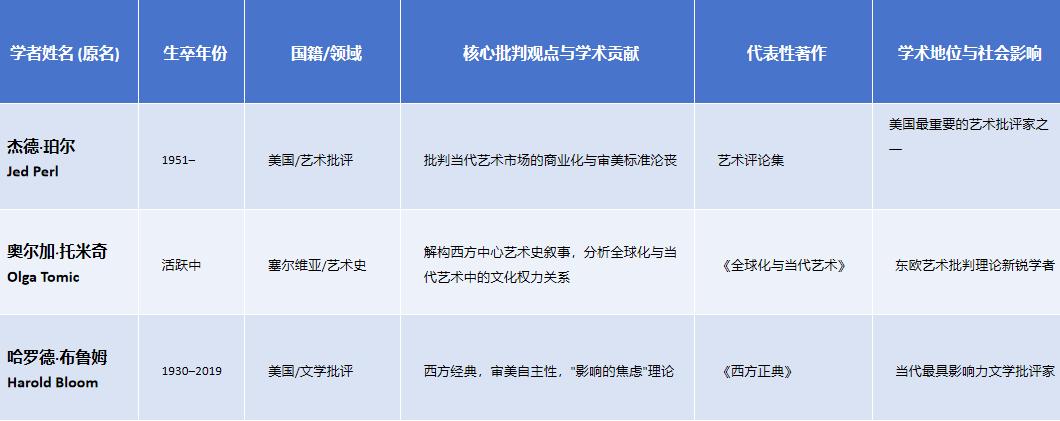 杰德·珀尔代表了审美保守主义的顽强抵抗,他尖锐地批判当代艺术市场与投机资本的共谋,指出这种合谋导致了审美标准的沦丧和艺术自主性的消亡。与此相呼应,哈罗德·布鲁姆通过"影响的焦虑"和"西方正典"论,在文学领域坚守一种精英主义的审美自主性,试图抵御文化相对主义和政治正确对文学价值的侵蚀。而奥尔加·托米奇等人则从后殖民与全球南方视角出发,系统解构西方中心主义的艺术史叙事,揭示其背后隐藏的文化权力关系与知识霸权。这些批判共同构成了对当代文化生产的全方位审视。