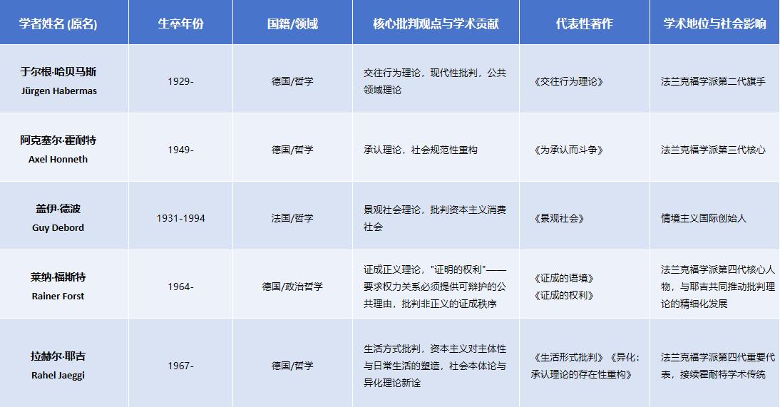 哈贝马斯的交往行为理论完成了批判理论的范式转型。通过"语言学转向",他将批判的根基从意识哲学转向主体间性的交往理性,以"理想言谈情境"和"公共领域"重构现代性的合法性基础。霍耐特进一步将这一规范维度发展为承认理论,提出"为承认而斗争"是社会冲突的道德动力,通过爱、权利与团结三种承认形式,揭示社会不公正的深层根源。新一代学者如福斯特和耶吉则将批判进一步精细化:福斯特的"证明的权利"要求权力关系必须提供正当理由;耶吉的"生活方式批判"则深入剖析资本主义对主体性与日常生活的塑造。与此同时,德波的"景观社会"理论以其激进诊断,揭示了社会关系被表象全面殖民的异化现实,为规范性理论补充了不可或缺的批判锋芒。