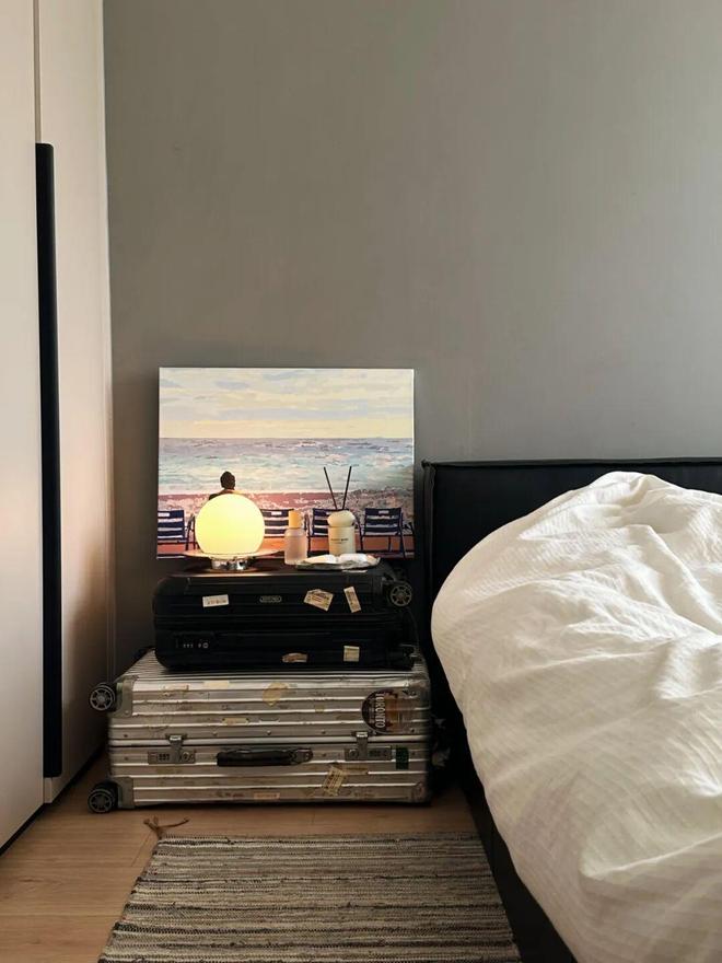 网友@YY日记:谁说行李箱一定要收纳起来,直接用来代替床头柜它不香吗?不仅让闲置物品得到了利用,又解决了收纳难题。更关键的是,它既能收纳又能置物,非常好用。