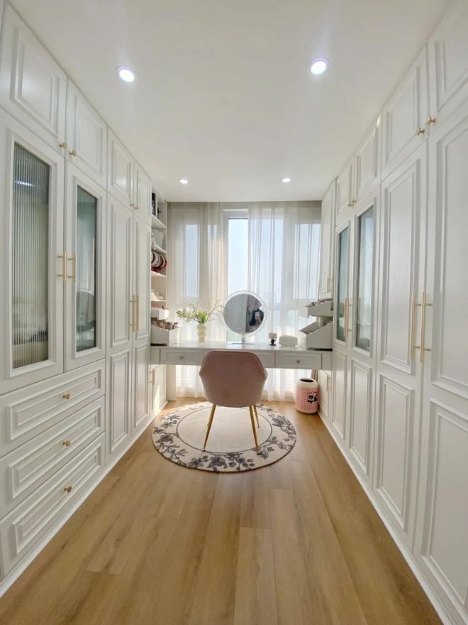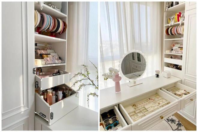 网友@不怎么肉的肉球:装修最庆幸的,就是在化妆桌两边分别设计一组侧柜专门收纳化妆品囤货,从而让桌面永远干净整洁。