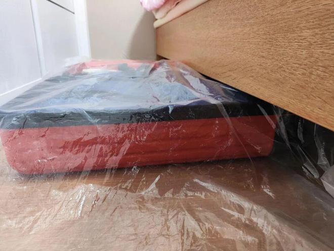 网友@楠的家:装修没给行李箱设计收纳区的宝子,可以跟我学。把行李箱打开,再套一个大塑料袋,最后塞到床下收纳。