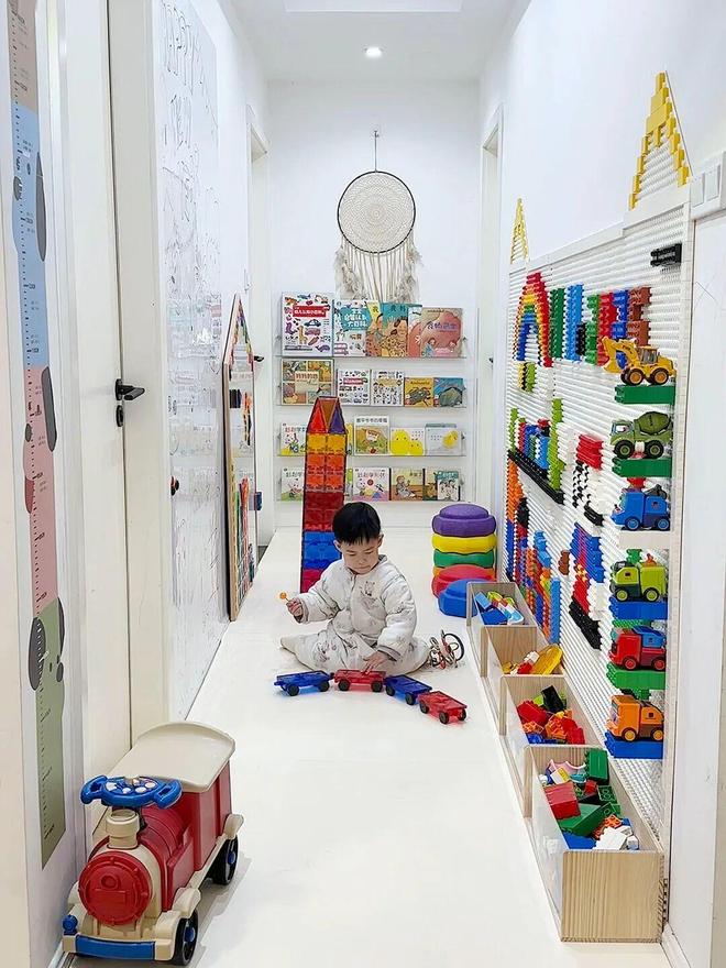 一边墙面贴上白板,给孩子乱涂乱画;一边墙面安装上积木;过道尽头墙面再安装上绘本架,他能在这里乐呵呵玩一整天。