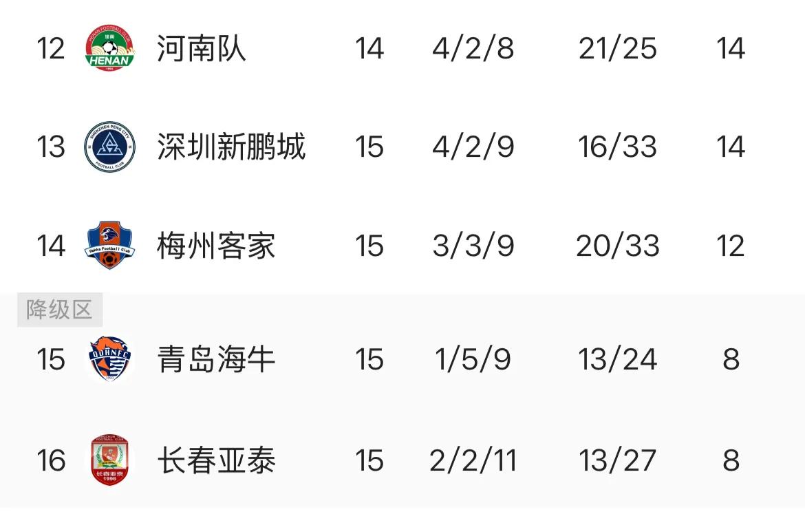 目前,场均不超过1分的球队有5支,呈现3+2的格局。2就是长春和青岛海牛,都是8分,直接就在保级线上;3则是14分的河南、深圳和12分的梅州。