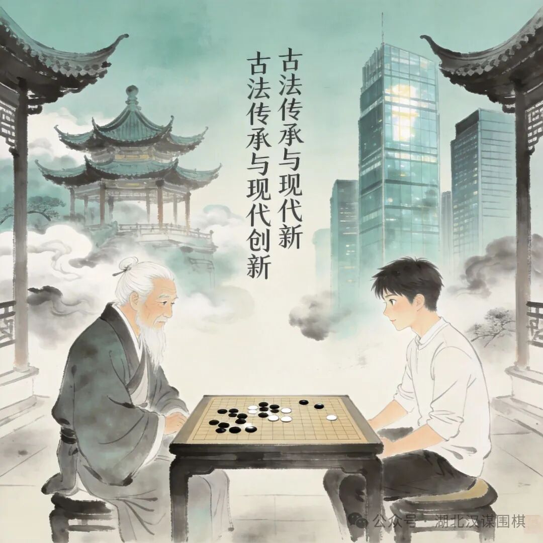 年轻棋手与老将对坐,古典亭台与现代高楼交融,象征“古法传承与现代创新”