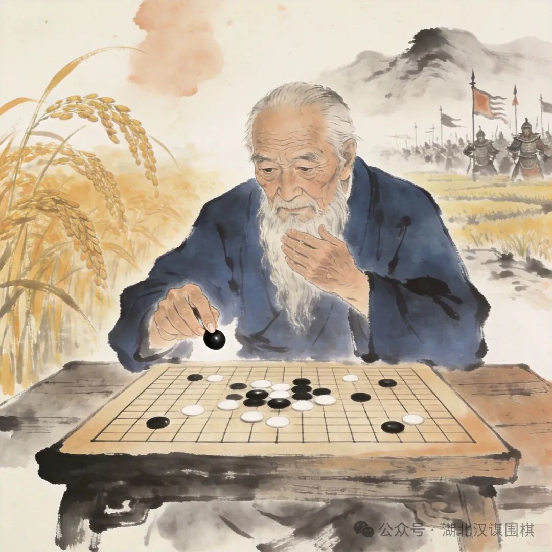 围棋老将沉思,背景融合耕田与战场,体现“耕战哲学”
