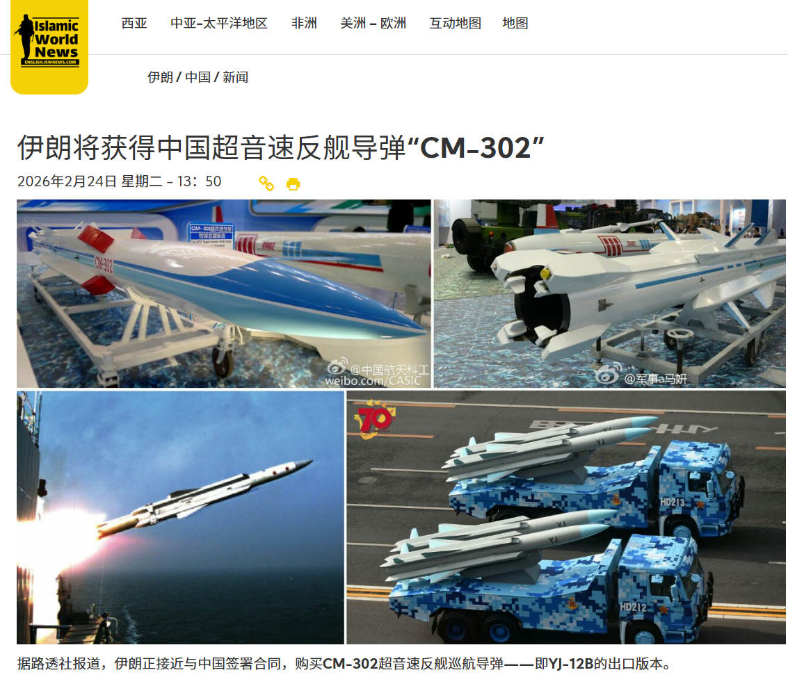在当下美军舰机密集部署,中东局势日趋紧张的背景下,路透社2月24日的报道,援引六名知情人士消息,称伊朗正接近与中国达成采购CM-302 超音速反舰导弹的协议。