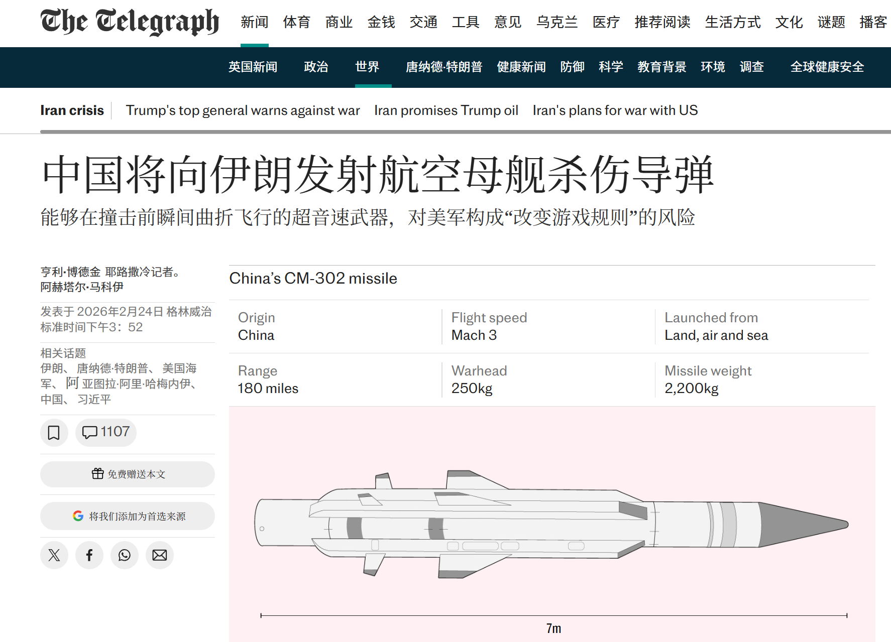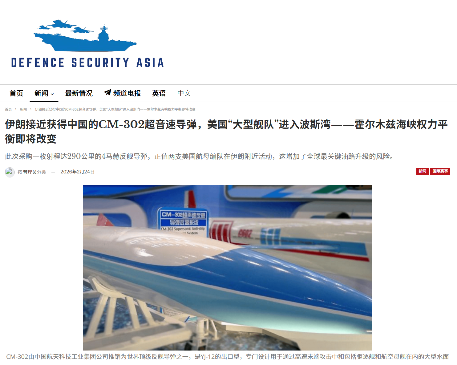 然而,均重点强调了CM-302反舰导弹的全程超音速、低空突防能力强大,关键是对航母的威胁极大,可见这款反舰导弹的影响力还是有的,难怪路透社率先报道以后,鉴于当前中东局势的敏感性,就纷纷随着其节奏起舞了。
