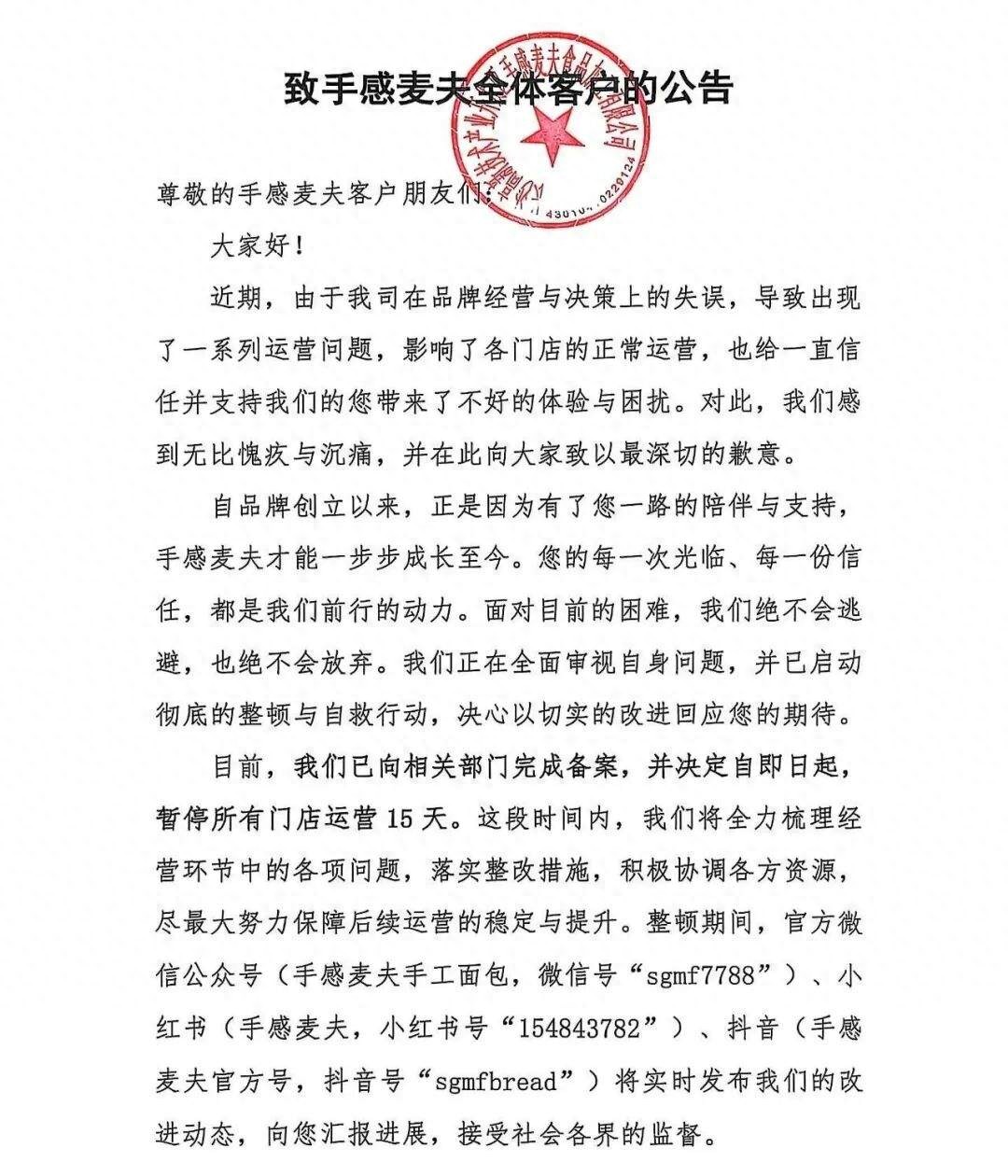 12月22日,手感麦夫官方发布公告称,其在品牌经营与决策上的失误,导致出现了一系列运营问题,影响了各门店的正常运营,即日起,所有门店停业15天进行整改。
