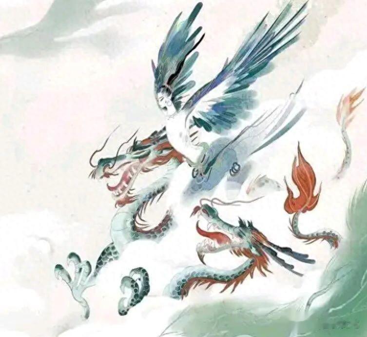(据传,句芒神有着一种独特形象:他的面容方正,身形似人却有着鸟的翅膀,那对大翅膀仿佛是他的飞翔之翼。然而,他并非必须依赖翅膀飞行,因为他还有两条小青龙,可以踏云而行,腾飞于九天之上。“东方句芒,鸟身人面,乘两龙。”这是《山海经·海外东经》中的记载。)