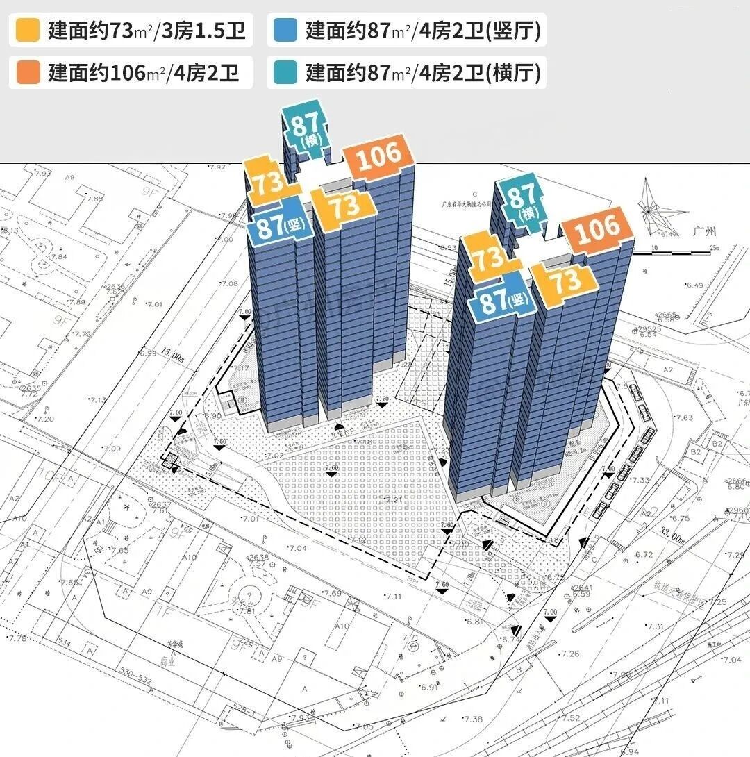 如果预算有限,国贸石围塘项目是个不错的刚需选择。它离石围塘地铁站 D 口很近,高层北向单位还能看江景。主力户型是 73-106㎡的三四房,使用率特别高,110% 起步,最高能到 120%——73㎡做三房,小家庭住完全够。