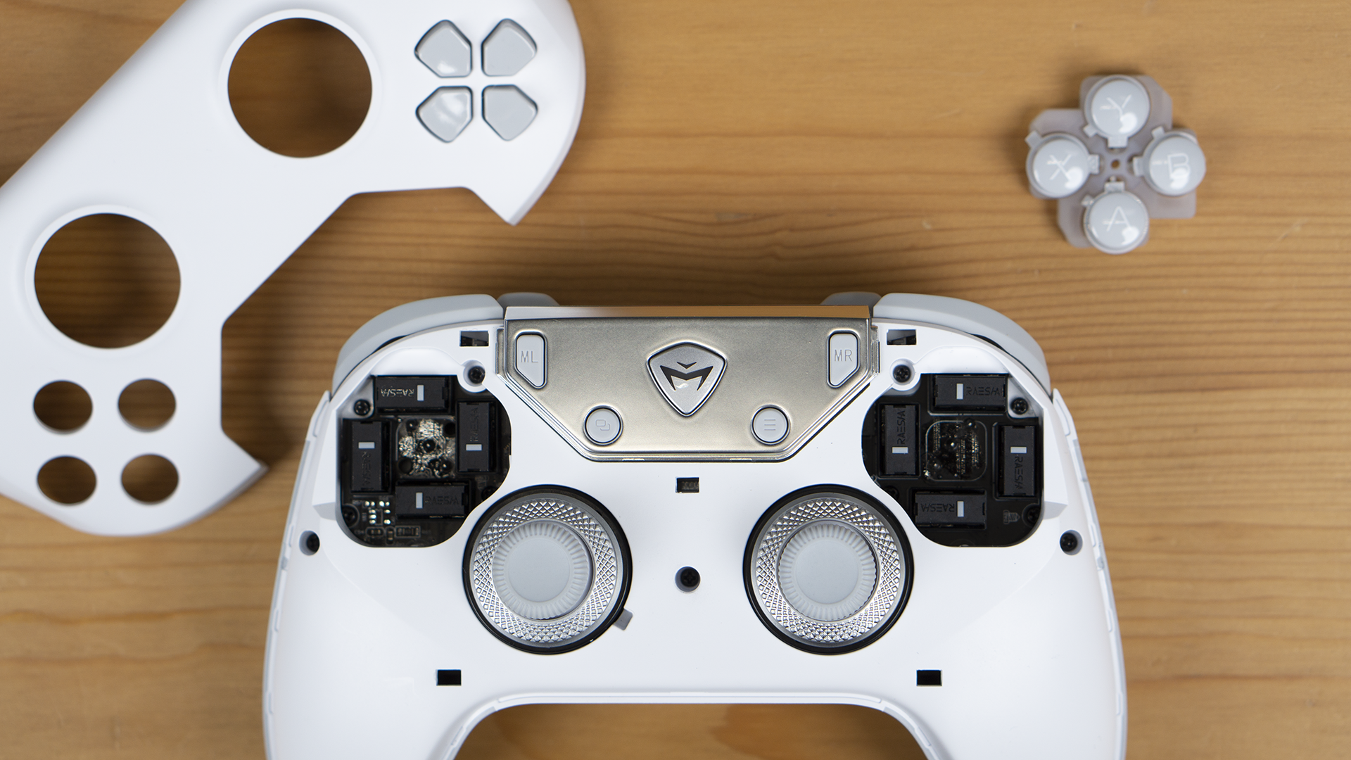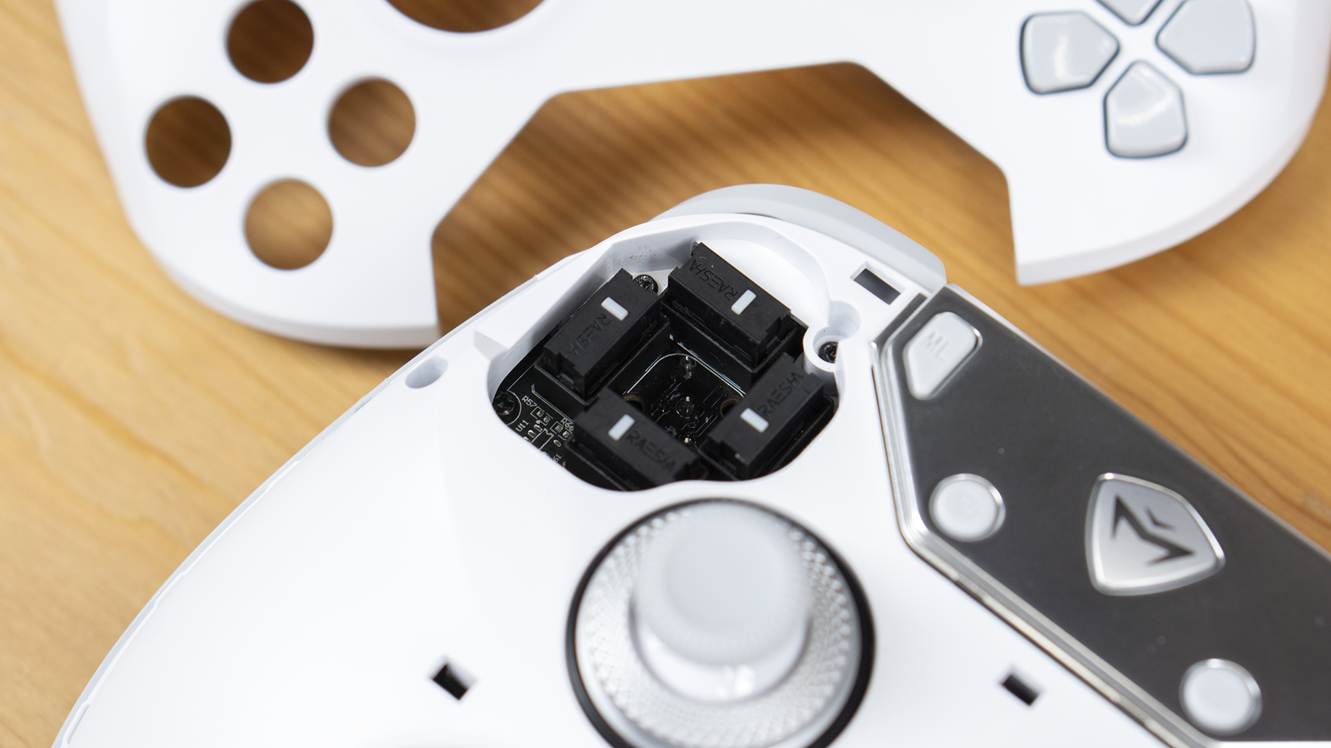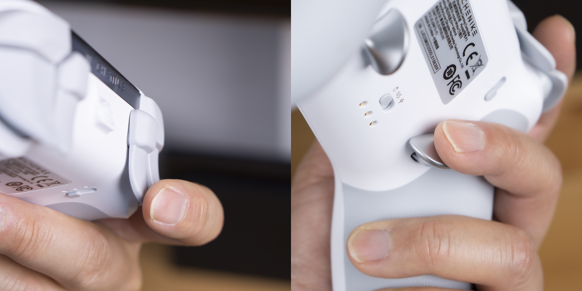 手柄的顶部除了常见的一对肩键、一对扳机按键外,还有两个小的可替换自定义按键。我们可以根据自己的习惯,替换为长柄按键或保留小按键结构。