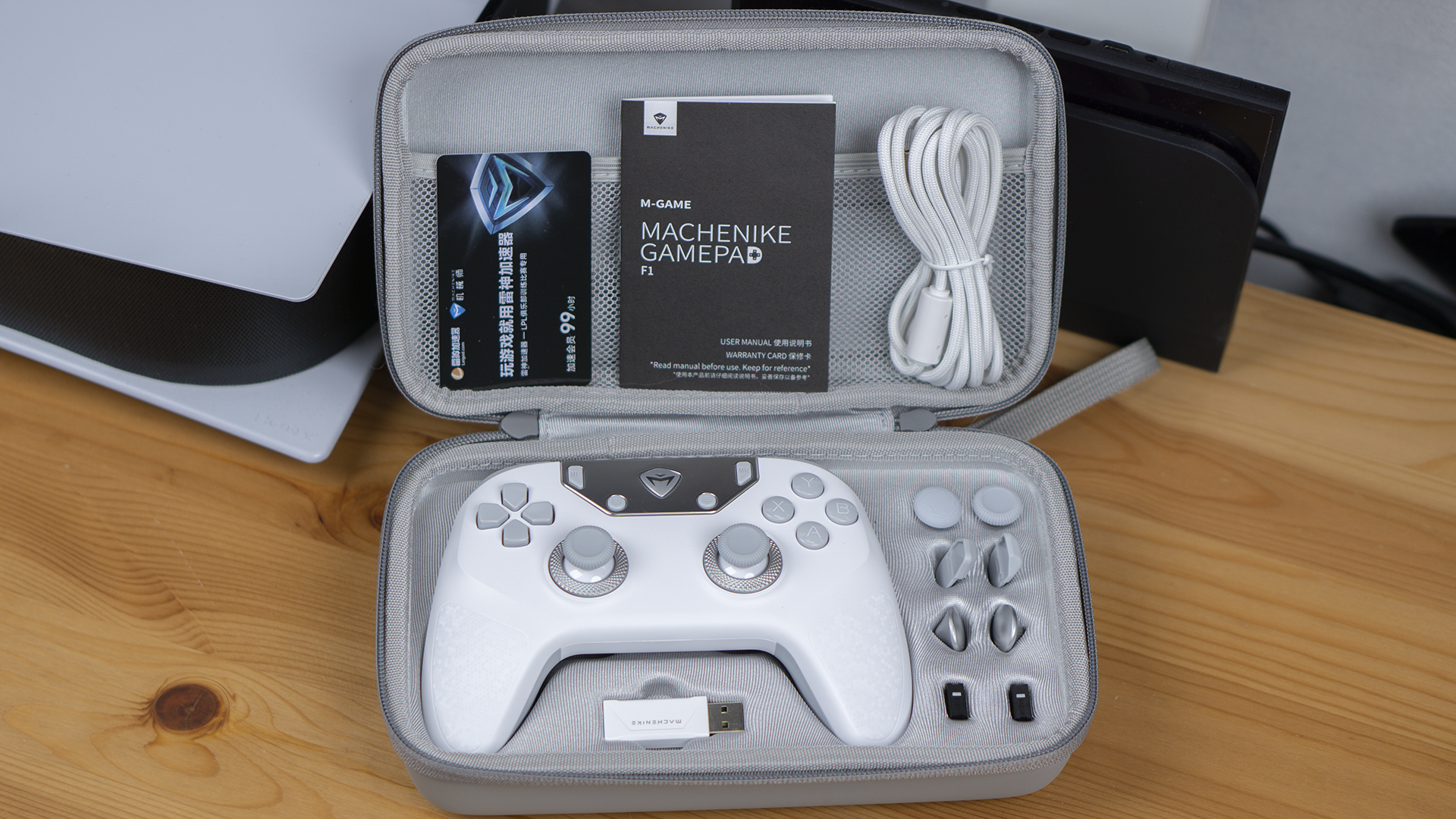打开它,我们就可以看到机械师F1手柄的本体了。它的正面是2.4G 8K接收器,右侧是可替换的摇杆帽、自定义的肩键、背键、两个替换微动、一根USB转TYPE-C、一本说明书及一个99小时的雷神加速器体验卡。