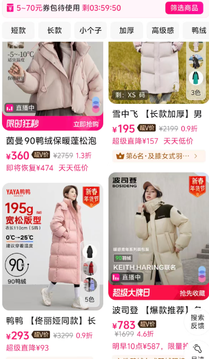 这背后有着一条消费暗线:高端消费者开始主动拥抱性价比,用信息差完成消费升级。以唯品会为例,今年冬天,平台上波司登、鸭鸭、雪中飞等羽绒服销量明显增长。不少消费者发现,曾经在专柜犹豫的款式,换个渠道,价格可能直接腰斩,甚至低至2—3折。