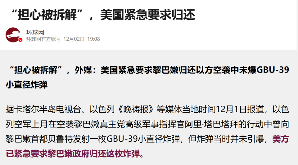 以色列空袭黎巴嫩时投下的一枚美制炸弹未能引爆,美国竟然要求黎巴嫩归还这枚“哑弹”。