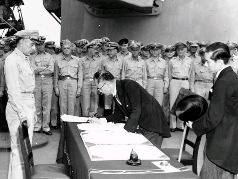 1945 年 9 月 2 日,东京湾 “密苏里” 号战列舰上,日本外相重光葵拄着拐杖瘸着腿签字。