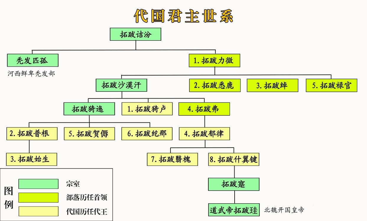 2.拓跋普根:拓跋猗卢之侄,平叛即位。拓跋普根是拓跋猗迤之子,早年担任右贤王,统领代国西部地区。