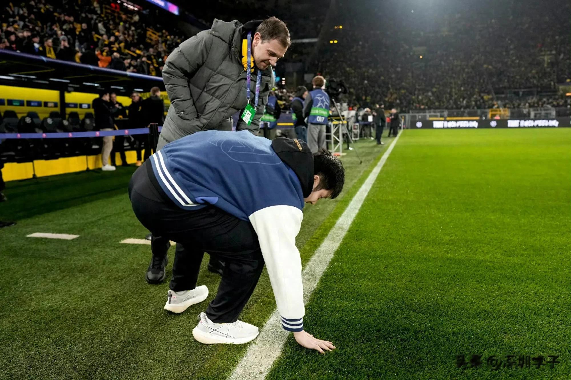 樊振东真的是个很细心,心思很细腻同时仪式感很强的男人,你看他,俯下身去,用指尖轻轻感觉草坪的软度密度以及厚度,感受绿茵场的质量。