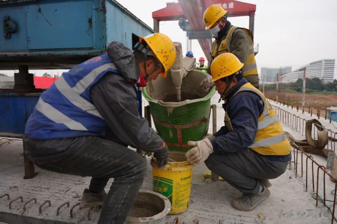 落梁完成的瞬间施工人员迅速展开下一步作业“立即进行注浆!”现场一声令下施工人员开始对梁体进行注浆作业梁体与桥墩快速凝固为牢固的整体