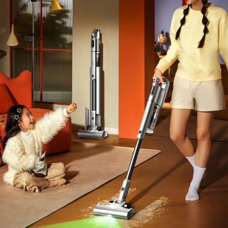 追觅 V15s 延续品牌对深度清洁的追求,整体采用磨砂材料与沉稳灰色调,搭配人体工学手柄设计,使单手持握舒适且不易疲劳。机身约 1.76 kg,配合底部转换头,可轻松滑入床底、沙发下等低矮空间,使用高效自然。设备核心搭载 Hyperdymium™ 数码马达,提供高达 200AW的强劲吸力,并支持 最长 60 分钟续航,能满足中大型户型一次清扫需求。此外,V15s 配备绿光显尘灯与多个功能刷头,包括地面、缝隙、底部转换头等,配合官方的 HEPA 全机过滤系统,可捕获 ≥ 99.99% 颗粒。面向对洁净度与操作便利性要求高的用户,这款吸尘器在配置与体验上均表现出色。