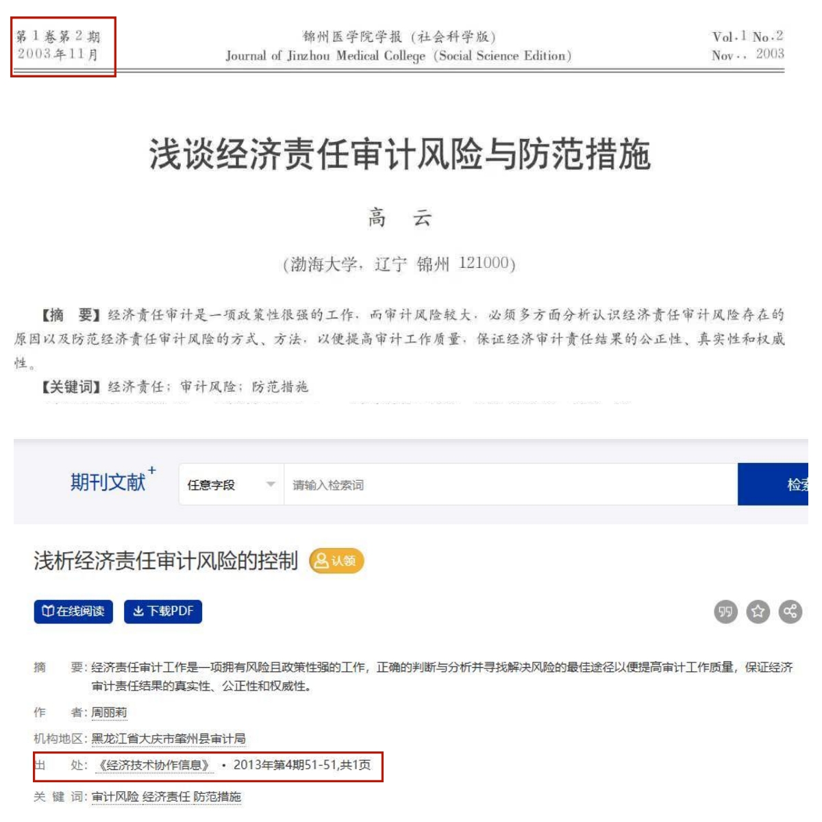 据原告提交的民事起诉状及侵权比对表显示:涉案权利作品为高云创作的《浅谈经济责任审计风险与防范措施》,2003年发表于《锦州医学院学报(社会科学版)》,作者享有完整著作权,后将维权权利转让给原告。被告周某莉2013年发表于《经济技术协作信息》的文章《浅析经济责任审计风险的控制》,第51页共66行内容与权利作品第77-78页段落高度重合,重复字数达1188字,构成著作权法意义上的“实质性相似”。